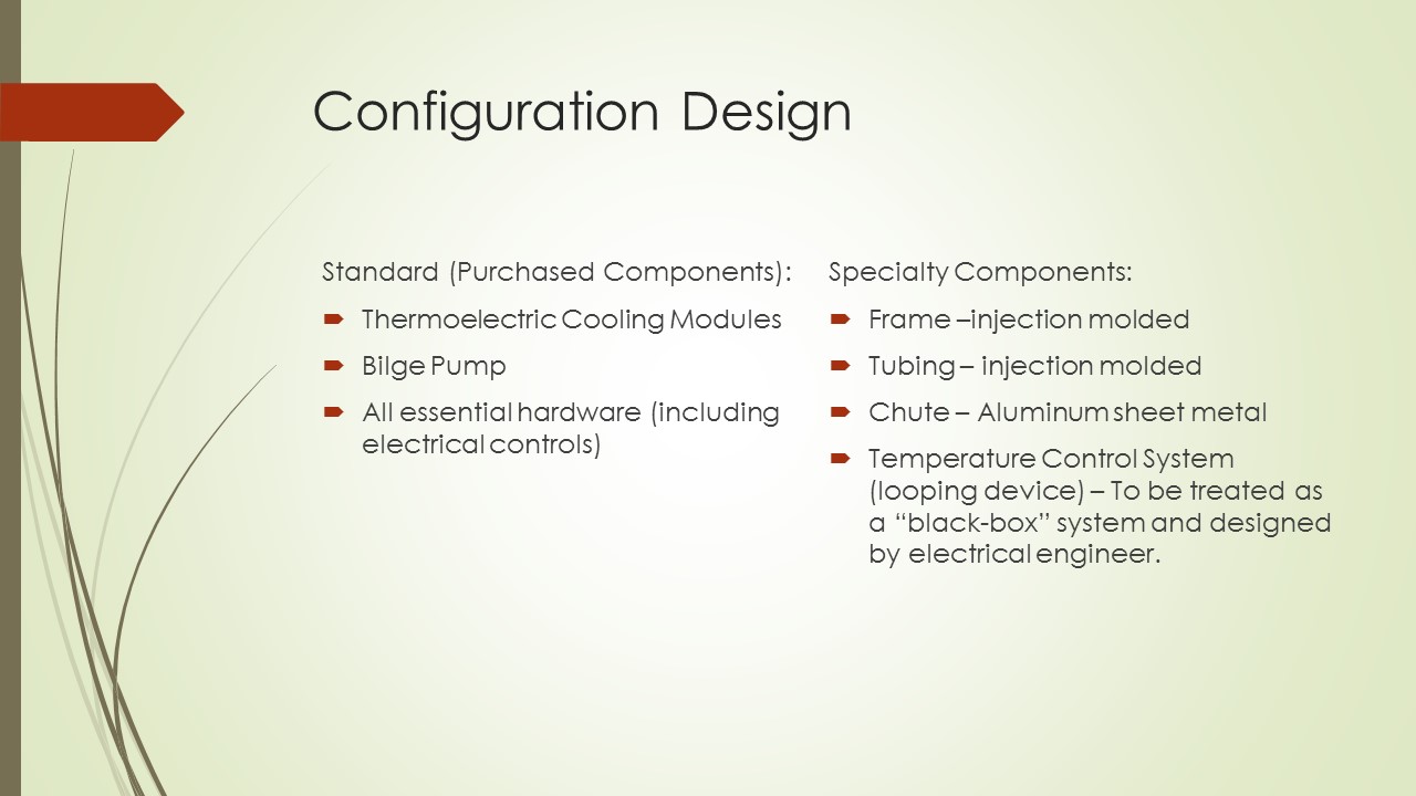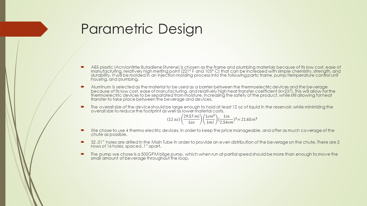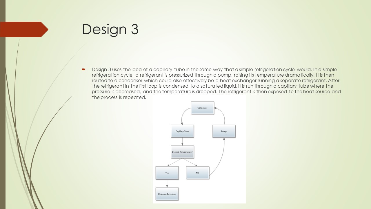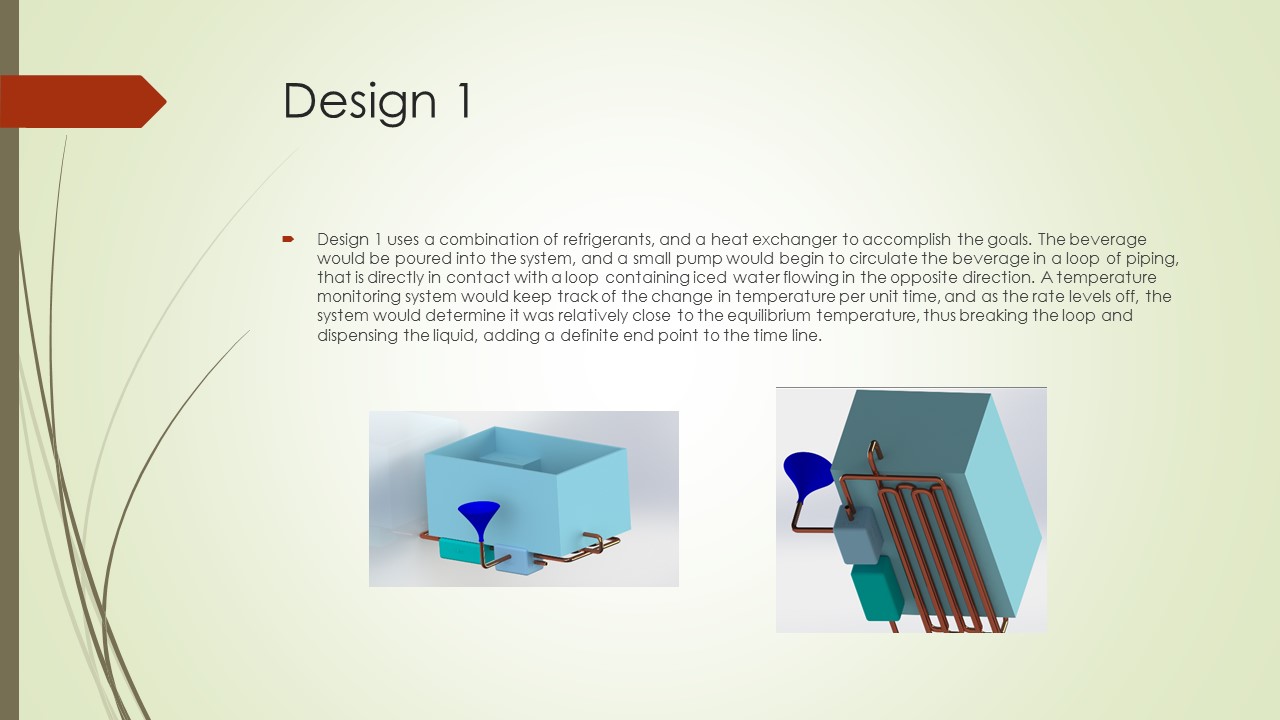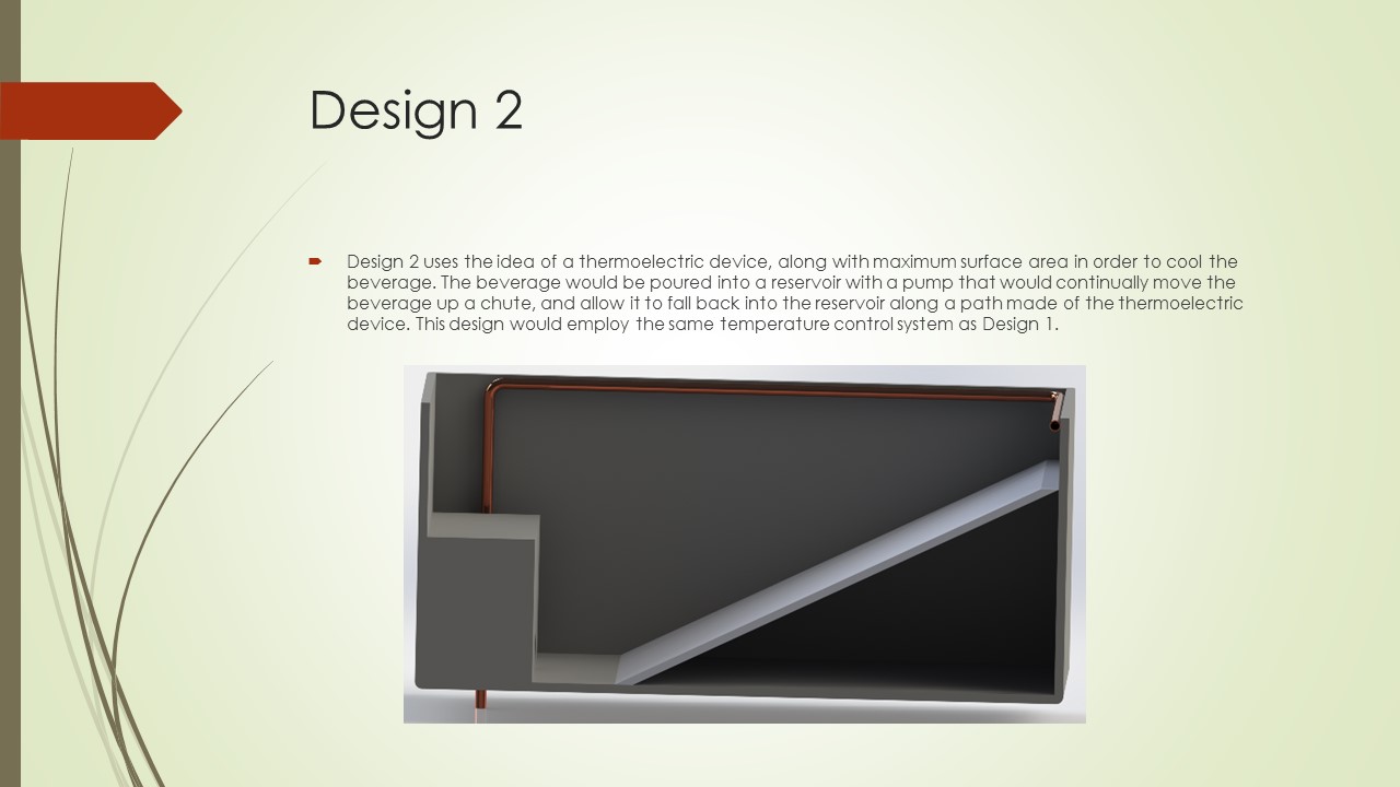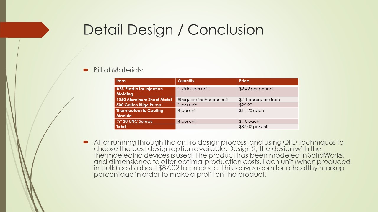 The slides shown above outline my process to choose and design the best available option. This class was taken prior to most Mechanical core curriculum being taken. As such, I recognize that there are flaws in the actual design concepts. This project is to be taken as an example of design concept execution, not technical proficiency.